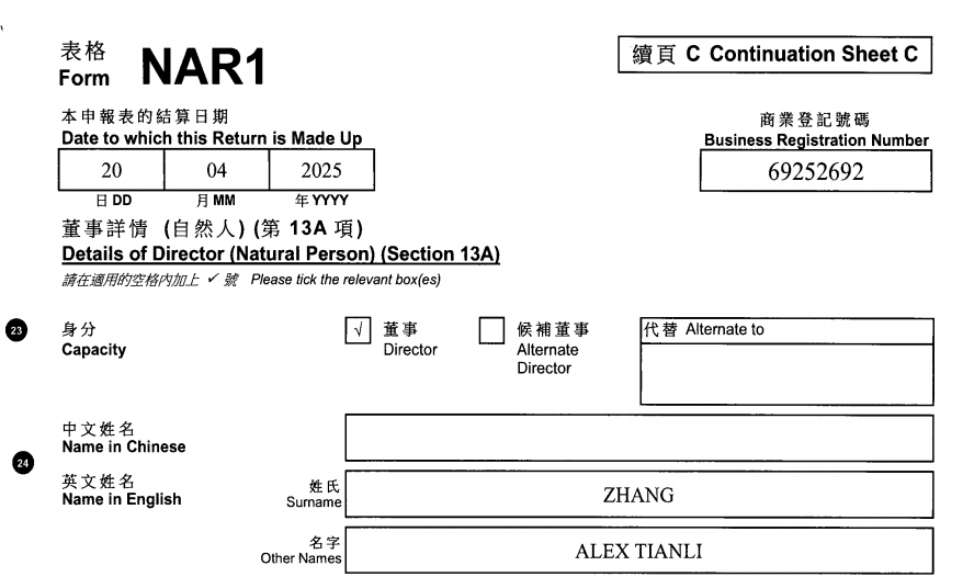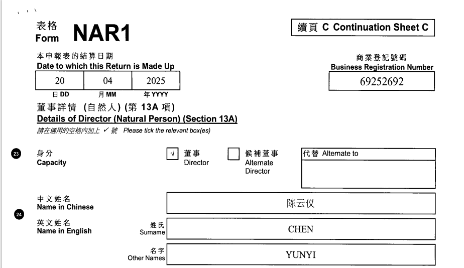 天眼查数据显示,上海绿捷实业发展有限公司的股东为GreenExpress Foods, Limited。时代周报记者从香港公司注册处获得的GreenExpress Foods, Limited周年申报表资料显示(结算日期为2025年4月20日),该公司的董事为王航、ALEX TIANLI ZHANG、陈云仪。
