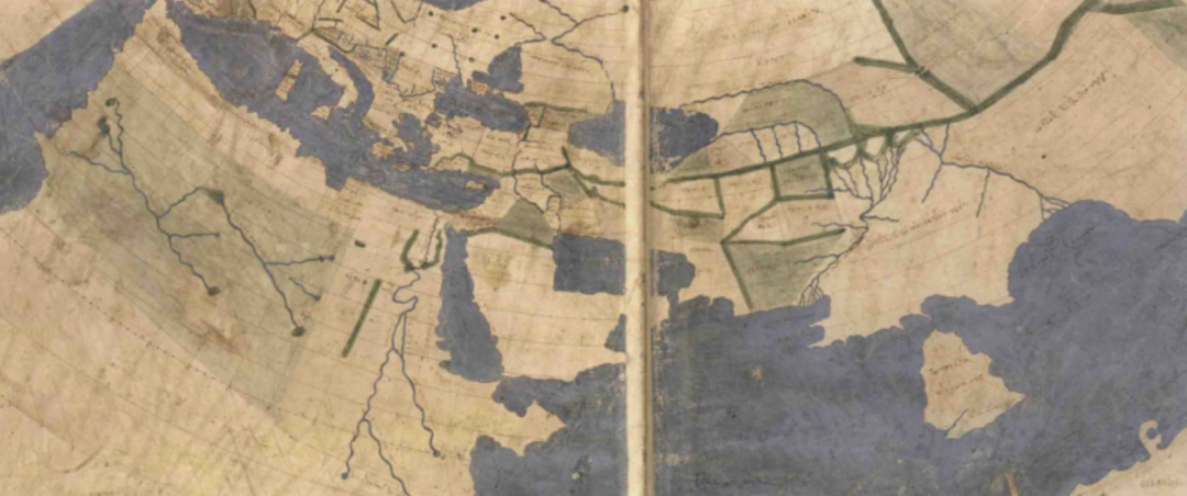 古希腊天文学家托勒密绘制的“世界地图”(实际上是欧洲、地中海沿岸及中东地图),可以看到上面纵横交错的格子 | 图源:DK《伟大的世界地图》
