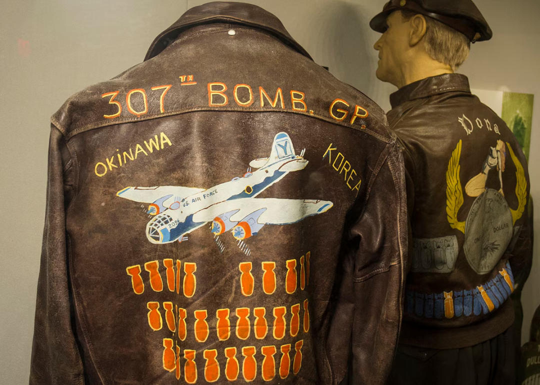 标记了番号、任务地点和投弹信息的一件美军二战夹克,可以看到是在朝鲜半岛、冲绳(Okinawa)执行对日作战。美国国家空军博物馆中收藏的其他二战飞行夹克,有部分还绘制了投弹当量、日期、经纬度等纪念信息 | 图源:National Museum of the United States Air Force